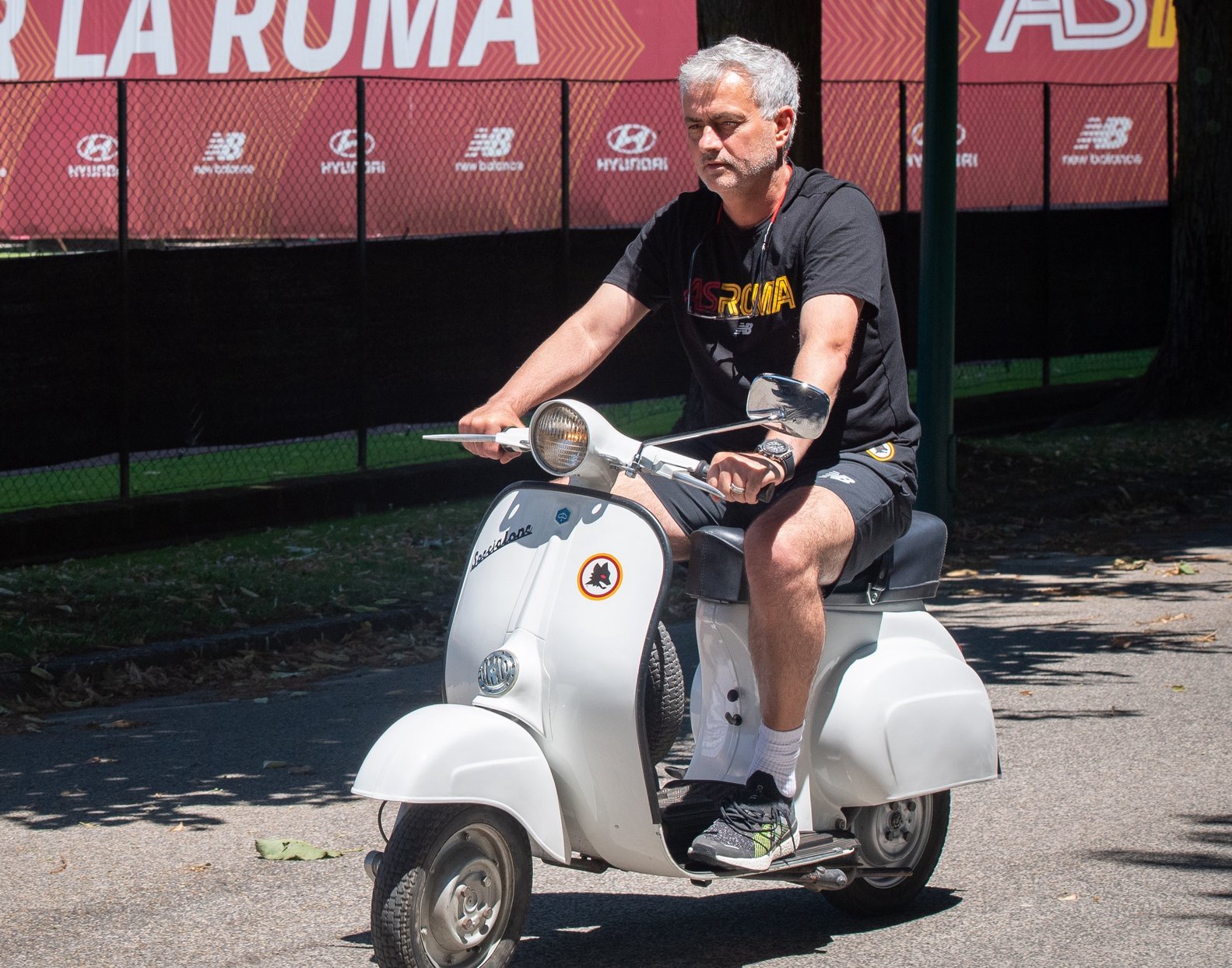 Jose Mourinho has been riding a Vespa around Romas training groundCredit. It seems that Mourinho liked the mural that street artist Harry Gribb painted for him in Rome and decided to implement it immediately as Jose was present. Its unclear at this stage why Mourinho was driving a Vespa around Romas training ground although we assume it was for business and not pleasure.